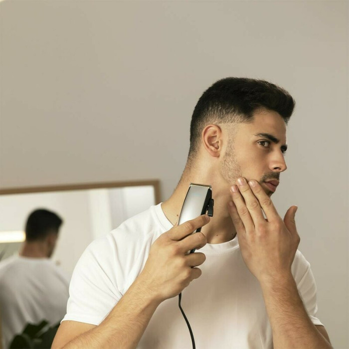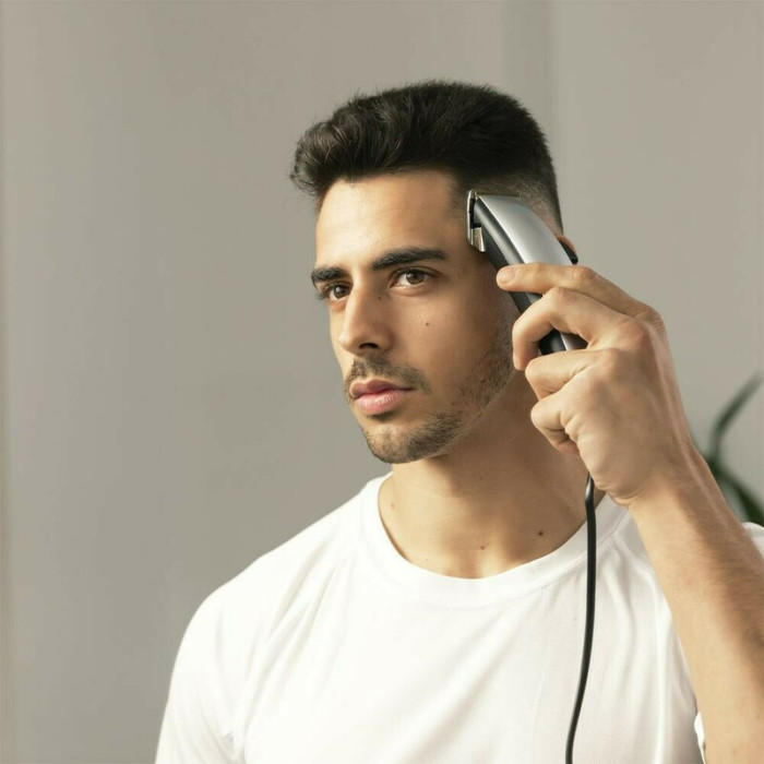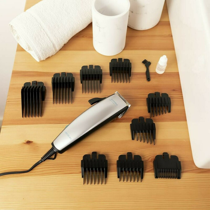 В комплект машинки входят 9 гребней – 7 направляющих (3/6/9/12/16/19/25 мм) и 2 для области ушей. Благодаря удобному регулятору длины вы сможете легко выставлять нужную длину для более точного среза.