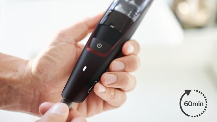 Зарядка триммера для бороды в течение 1 часа обеспечивает 60 минут автономной работы. Триммер также работает от сети, а функция быстрой зарядки в течение 5 минут гарантирует один полноценный сеанс подравнивания.
