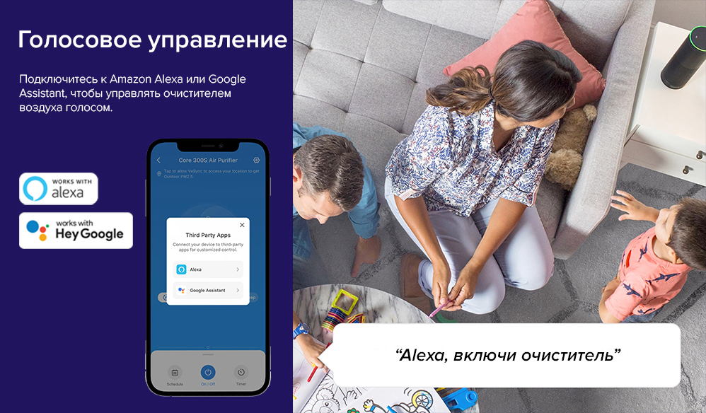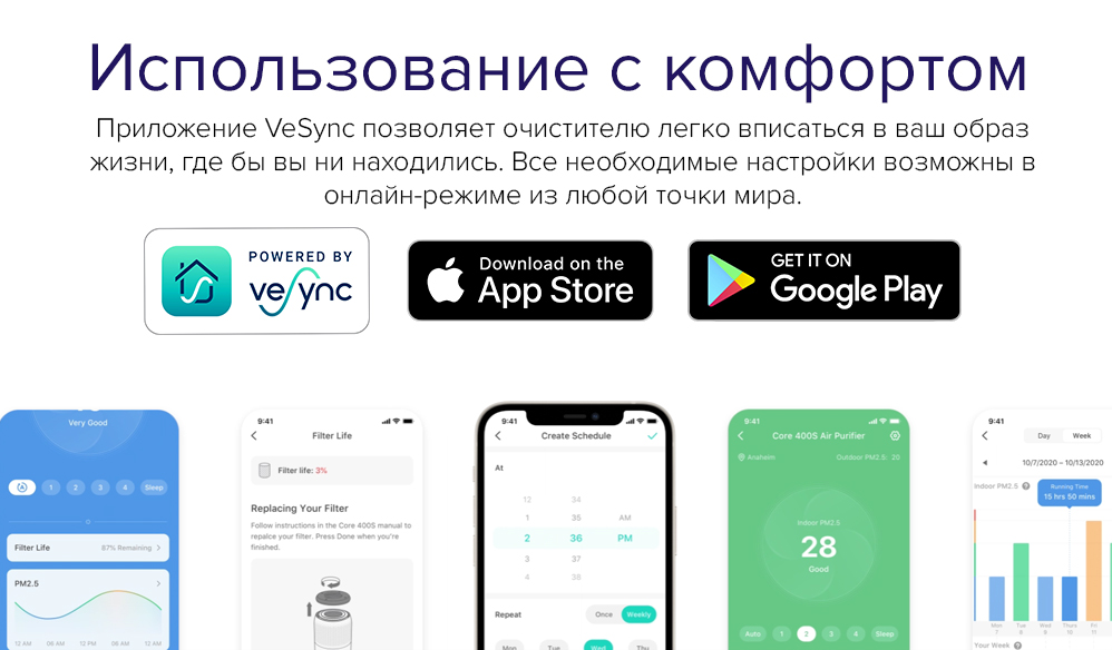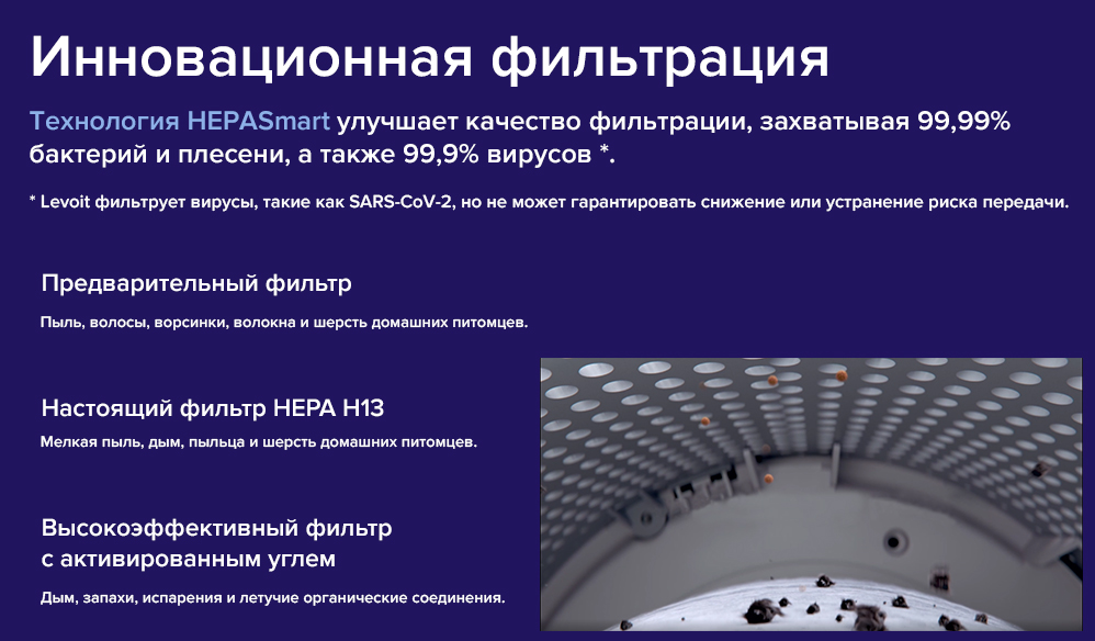 ECARF Сертификат; VortexAir™ Technology 3.0; Интеграция с Amazon Alexa, Google Assistant™; Приложение VeSync; Возможность интеграции в систему Умный дом; Очистка от аллергенов, от вирусов и бактерий, от газов и копоти, от запахов, от пыли, от пыльцы, от табачного дыма, от токсинов, от формальдегида, от шерсти животных; Управление со смартфона; QuietKEAP Technology; HEPASmart™ Technology