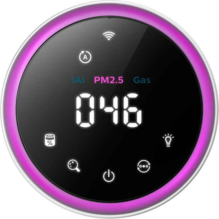 Удобный просмотр текущего уровня качества воздуха в вашем доме. На дисплее отображается числовая концентрация аллергенов, газов и частиц PM2.5, а цвет на световом кольце соответствует общему уровеню качества воздуха.