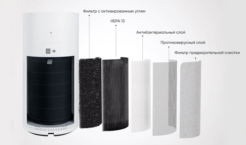 Предварительный фильтр задерживает крупные частицы – пыль, пух и шерсть домашних животных. HEPA-фильтр H13 улавливает большую часть переносимых по воздуху твердых частиц размером до 0,3 мкм – пыльцу и PM 2,5 (вредные мелкодисперсные частицы). Фильтр с активированным углем поглощает дым, неприятные запахи и летучие органические соединения. Тройная система избавляет от раздражающих аллергенов, обеспечивая здоровый воздух.