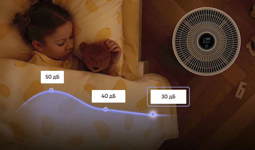 Чтобы дышать чистым и свежим воздухом можно было круглосуточно, предусмотрен ночной режим. Для очистки воздуха SmartMi снижает шум до 30 дБ и отключает яркую подсветку дисплея, продолжая выпускать здоровый воздух. Дышите свободно в любое время суток.