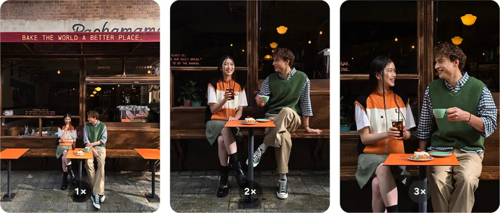 Перемикайтесь від 1х до 2х й навіть 3х зуму. Робіть знімки з яскравими деталями на більших відстанях наближення, ніж раніше.8 Наближайте дію та фіксуйте покращені деталі завдяки AI зуму. 9,10
