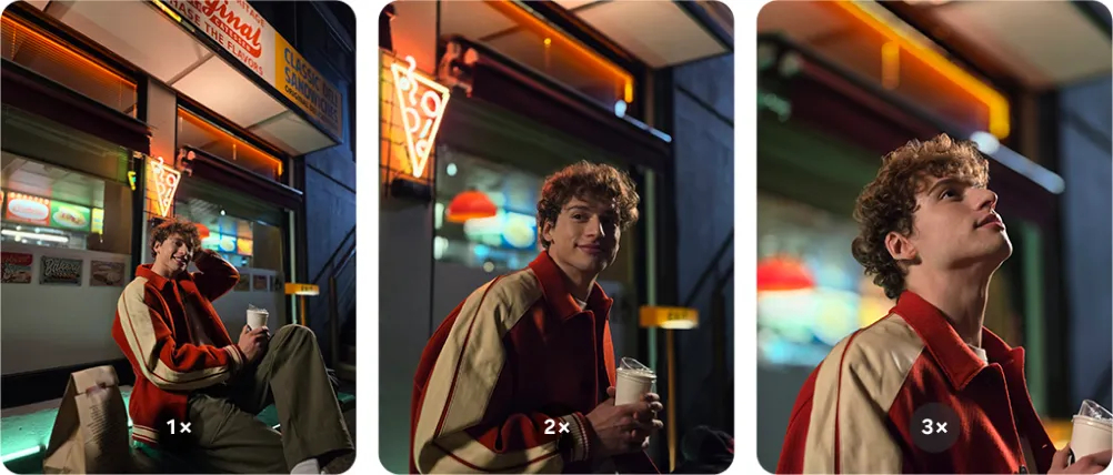 Перемикайтеся між різними рівнями зуму – від 1x до 3x. Створюйте захопливі кадри з видатними деталями на значних збільшеннях, ніж це було раніше. Наближайте перебіг подій і фіксуйте поліпшені аспекти завдяки використанню AI зуму. Відкривайте нові грані у світі фотографії, досліджуючи можливості максимального збільшення та фіксуючи навіть найдрібніші деталі.