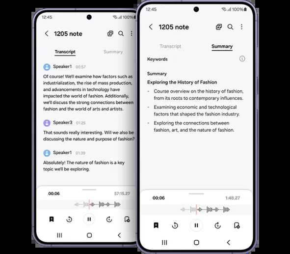 3. Для використання функції Помічник із розпізнавання потрібне підключення до мережі та вхід до облікового запису Samsung. Функція Помічник із розпізнавання доступна лише в попередньо встановленому застосунку Диктофон або для файлів, записаних за допомогою попередньо встановленого застосунку Samsung Phone. У певних країнах функція запису голосу за допомогою попередньо встановленого застосунку Samsung Phone не підтримується. Обробляти можна лише аудіофайли тривалістю до 3 годин. Режим підсумовування тексту в Помічнику із розпізнавання застосовується до текстів, які містять певну кількість символів. Доступність послуги залежить від мови. Точність результатів не гарантується.
