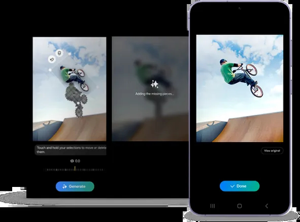 4. Для використання функції Згенероване редагування потрібне підключення до мережі та вхід до облікового запису Samsung. Результатом застосування функції Згенероване редагування є змінена фотографія розміром до 12 МП. Під час збереження на згенероване за допомогою штучного інтелекту зображення накладається водяний знак. Точність і надійність згенерованого результату не гарантується.