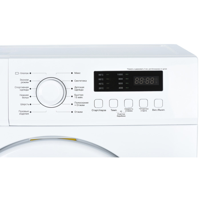 - Программы: Хлопок, Эконом, Спортивная одежда, Белье, Шерсть, Пуховые изделия, Микс, Синтетика, Детская одежда, Супербыстрая стирка за 15 минут, Полоскание и отжим, Отжим;
