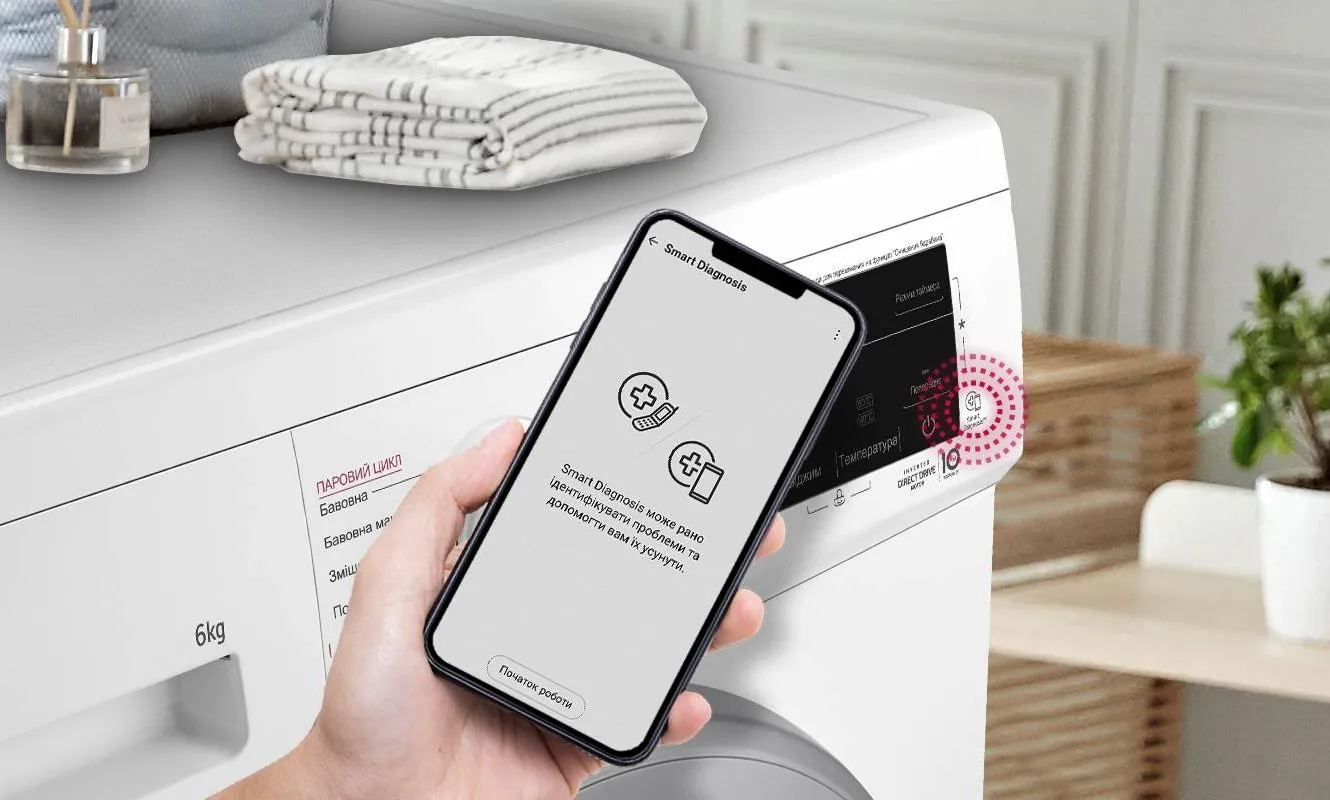 Функция мобильной диагностики Smart Diagnosis™ обнаруживает сбои в работе и обнаруживает внутренние неисправности машины. Полученная информация быстро передается в сервисный центр. Чтобы активировать Smart Diagnosis™, нужно только установить приложение LG ThinQ™ на ваш смартфон.
