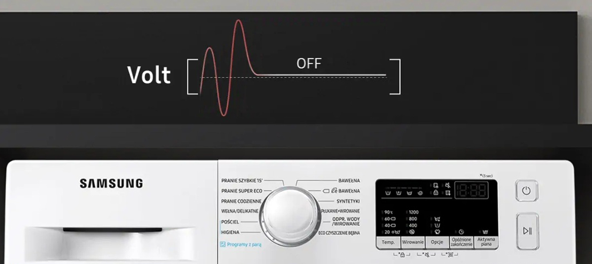 Функция Volt Control защищает машину от скачков напряжения питания. Она фиксирует значительное повышение напряжения питания и автоматически выключает машину. Это предотвращает повреждение стиральной машины.