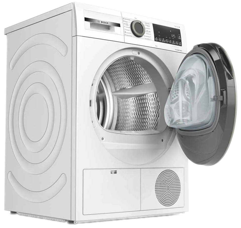 Bosch WQG14200UA отличается экономным потреблением электроэнергии благодаря технологии теплового насоса, который подает горячий сухой воздух внутрь, обеспечивая постоянную циркуляцию воздуха для эффективного высушивания белья. А также использует новый, более экологически чистый охлаждающий агент R290 — самый экологичный натуральный охлаждающий агент, доступный на рынке.