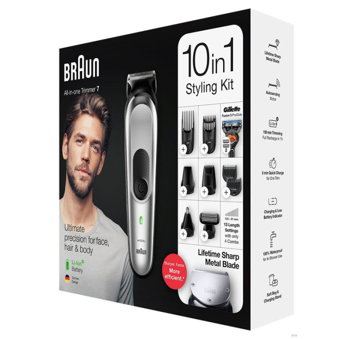 Безупречный внешний вид, в частности, это аккуратно подстриженные волосы на голове и бороде. Обычно, чтобы привести их в надлежащее состояние, приходится отправляться в ближайшую парикмахерскую, но можно найти не менее удачное альтернативное решение, купив триммер Braun MGK 7221. Этот компактный прибор по размерам примерно соответствует электробритве, но выполняет иные функции. Простой сменой насадок подбирается оптимальная длина стрижки. В комплекте 2 гребня с регулировкой, фиксированные насадки для подстригания (1 и 2 мм). Кроме того, триммер имеет 2 мм шаг на 13 позиций.