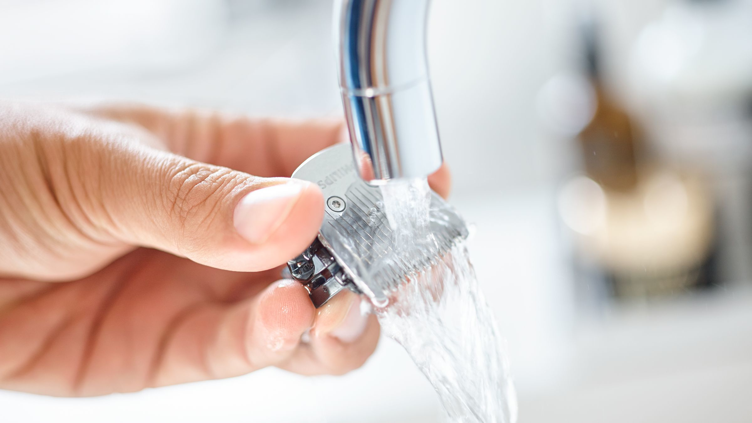 По завершении подравнивания просто снимите лезвия, потянув за них вверх, после чего сполосните лезвия и гребень под водой, очистите встроенную камеру и стряхните оставшиеся волоски с помощью прилагающейся щеточки для очистки — это обеспечит качественную работу прибора в течение долгого времени.
