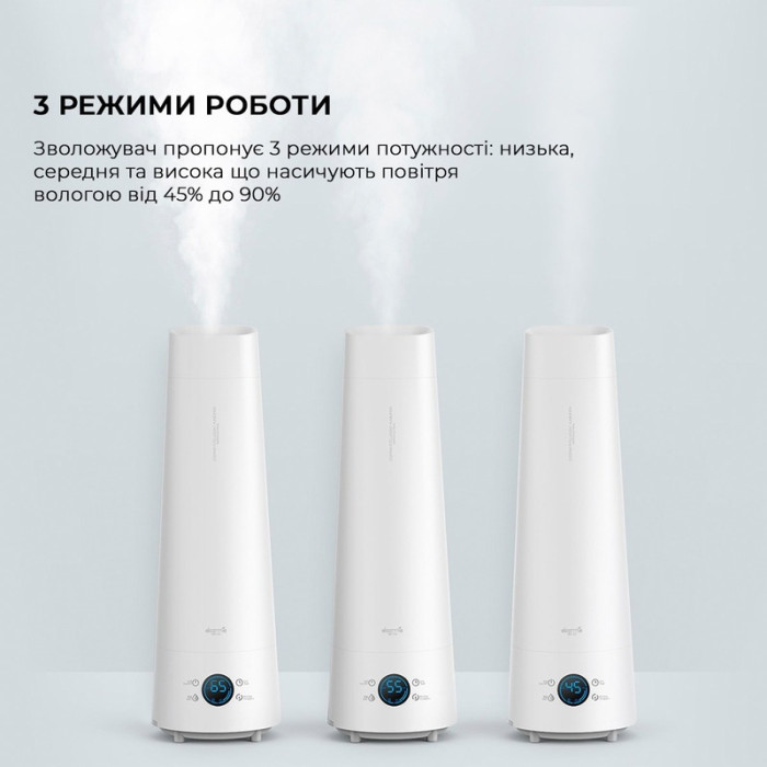Для выбора оптимального уровня влажности, в DEERMA DEM-LD220 предусмотрено 3 рабочих режима, которые вы можете активировать на свое усмотрение. Если в жаркий летний день, вы хотите вернуться в увлажненное помещение, просто залейте воды в резервуар увлажнителя, и установите таймер.