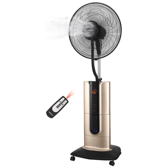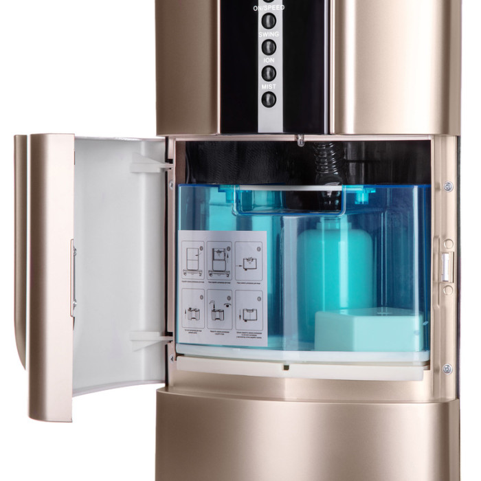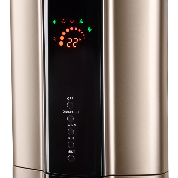 Вентилятор напольный черного цвета с функцией увлажнения, ионизацией и защитой от москитов. Для удобного управления предусмотрен дисплей с цветной индикацией и пульт ДУ. Модель выполнена из надежных, практичных и долговечных материалов, а в качестве подставки используется платформа с колесами.
