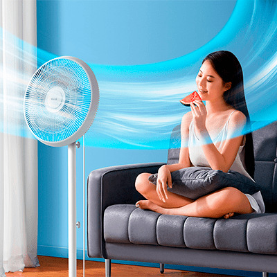 Напольный вентилятор DEERMA DEM-FD15W — мощное устройство для циркуляции воздуха в минималистичном современном дизайне.